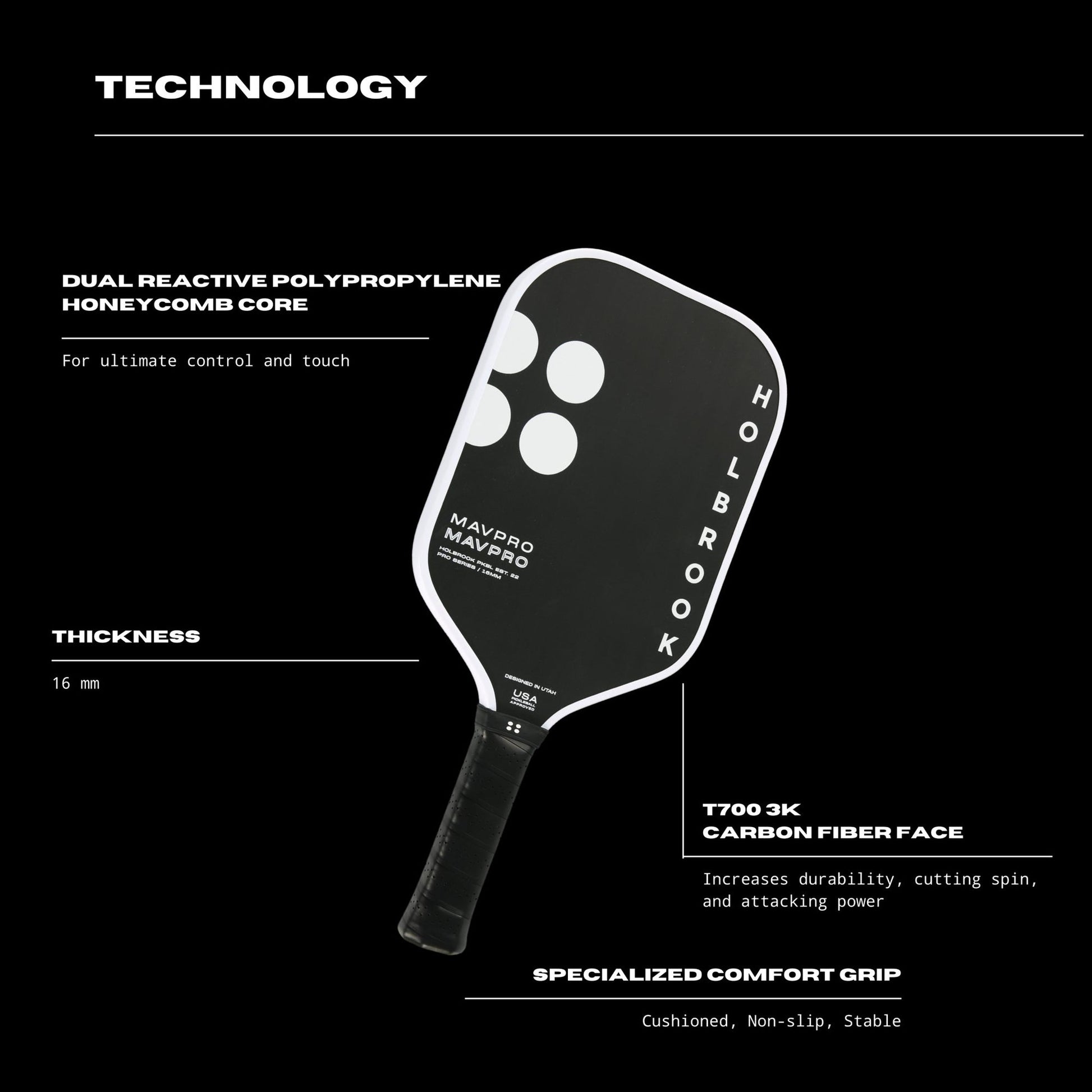 The Holbrook Mav Pro 2.0 paddle enhances attacking power, controlled finesse, and adds cutting spin to your game
