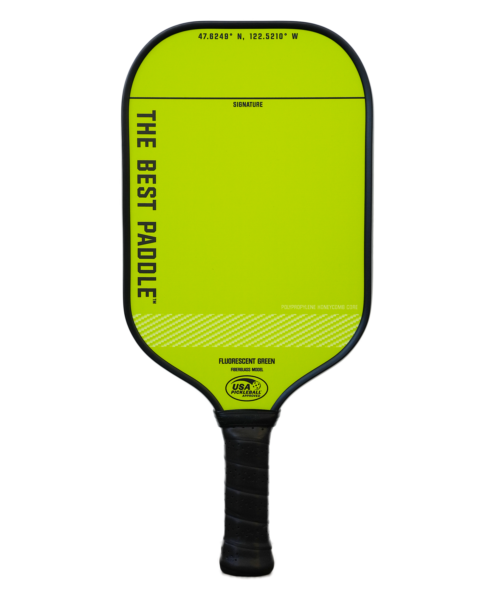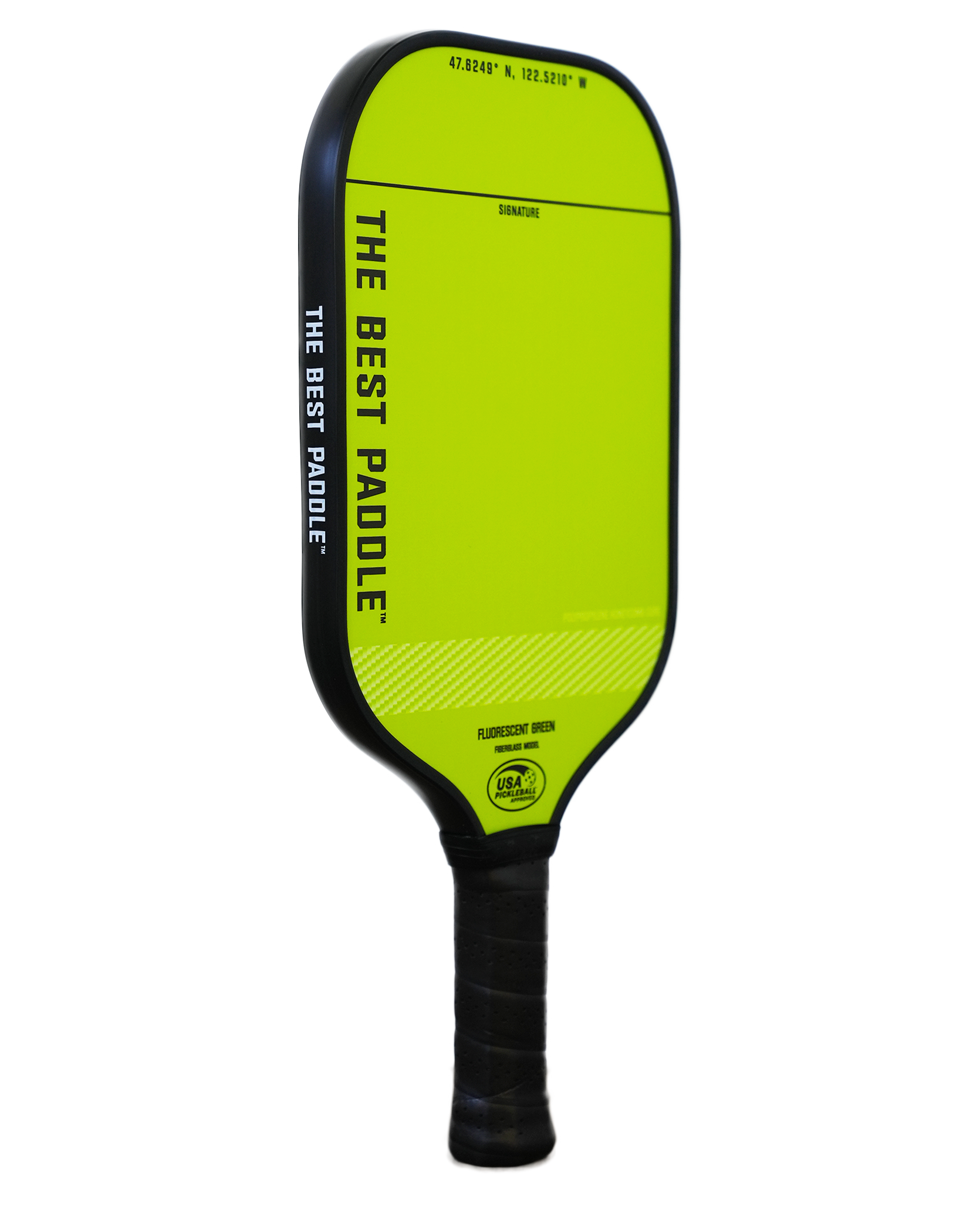 The Fiberglass Model Fluorescent Green pickleball paddle from The Best Paddle is certified by USAPA for competitive play, featuring a 16mm polymer honeycomb core and a fiberglass face for a reliable balance of power and control. This paddle is perfect for all levels of players, delivering strong, accurate shots both near the net and from the back court. It's a top paddle preferred by millions of players looking to win more games.