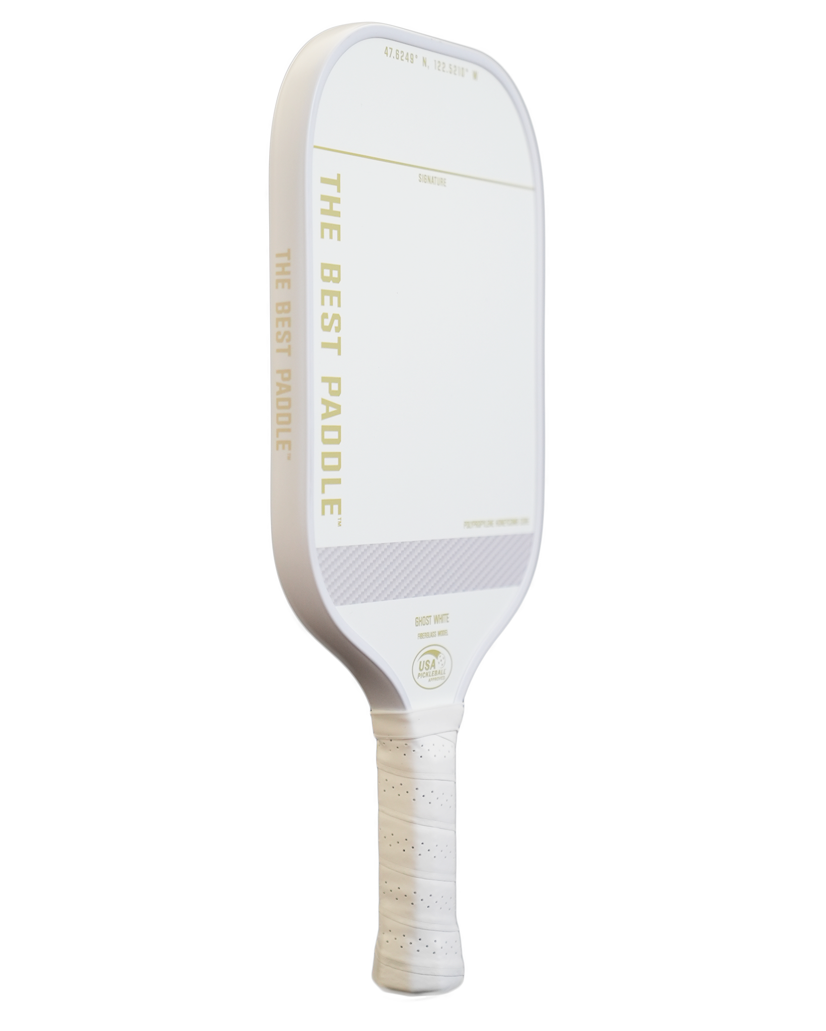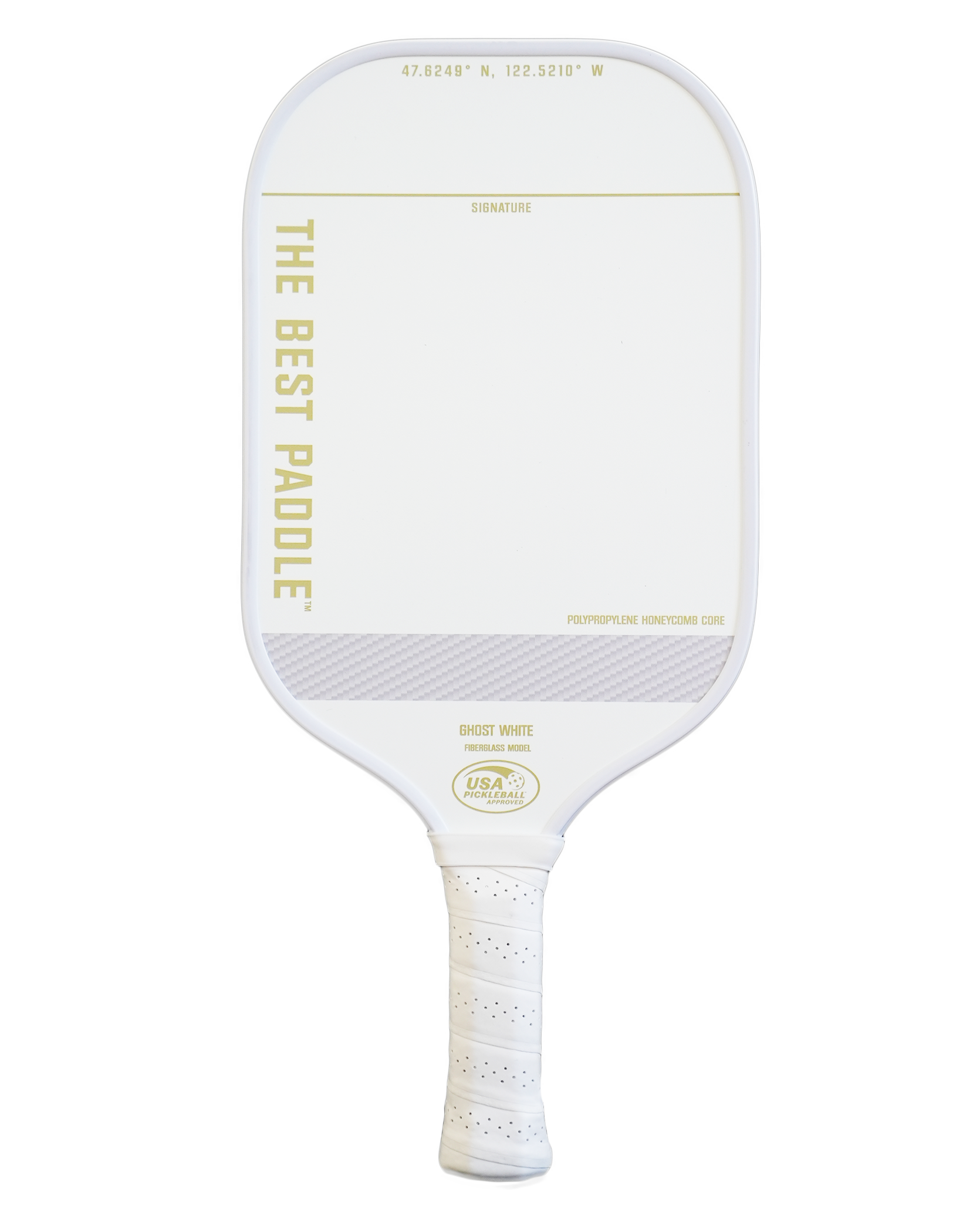 We call this paddle the "Ghost White Fiberglass Model" features a white grit fiberglass surface for the ultimate spin and ball control. Inside is a honeycomb polypropylene core for extreme power, or soft touch hits at the net. This core is one of the quietest cores available on the market. This paddle is elongated for those shots where you need to reach as far as you can. This paddle is great for beginner players to advanced.