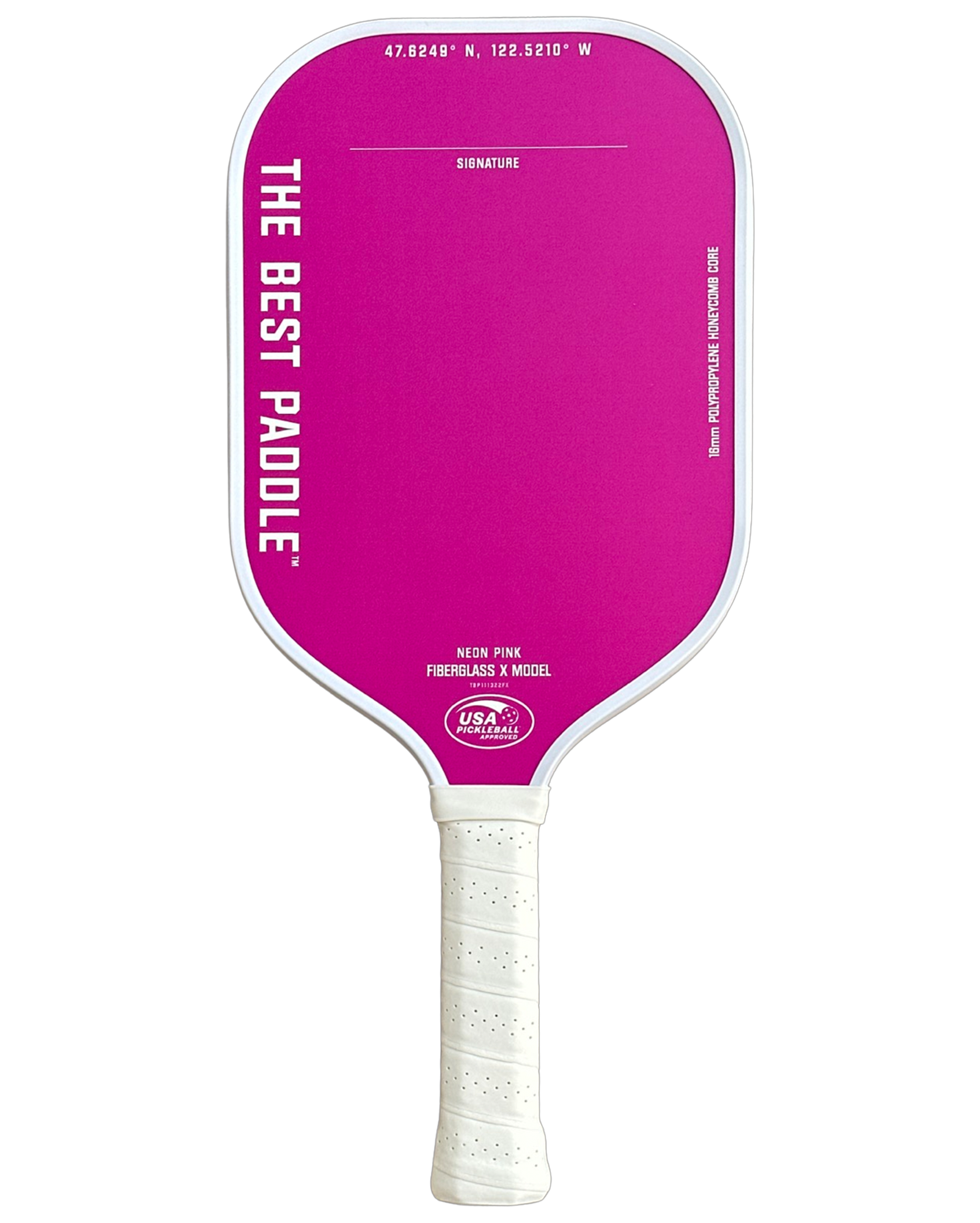 We call this paddle the "Neon Pink- Fiberglass X Model". It features a Neon Pink grit fiberglass surface for the ultimate spin and ball control. Inside is a honeycomb polypropylene core for extreme power, or soft touch hits at the net.